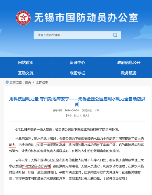 無(wú)錫國(guó)防動(dòng)員辦公室官網(wǎng)率先發(fā)聲,以《用科技國(guó)動(dòng)力量 守汛期地庫(kù)安寧——無(wú)錫金匱公園啟用水動(dòng)力全自動(dòng)防洪閘》為題,報(bào)道了水動(dòng)力全自動(dòng)防洪閘這一創(chuàng)新成果在無(wú)錫的成功應(yīng)用。在暴雨傾盆的汛期,金匱公園的地下空間得益于安裝了水動(dòng)力全自動(dòng)防洪閘,做到了“滴水未進(jìn)”,有力地確保了大眾生命財(cái)產(chǎn)的安全。